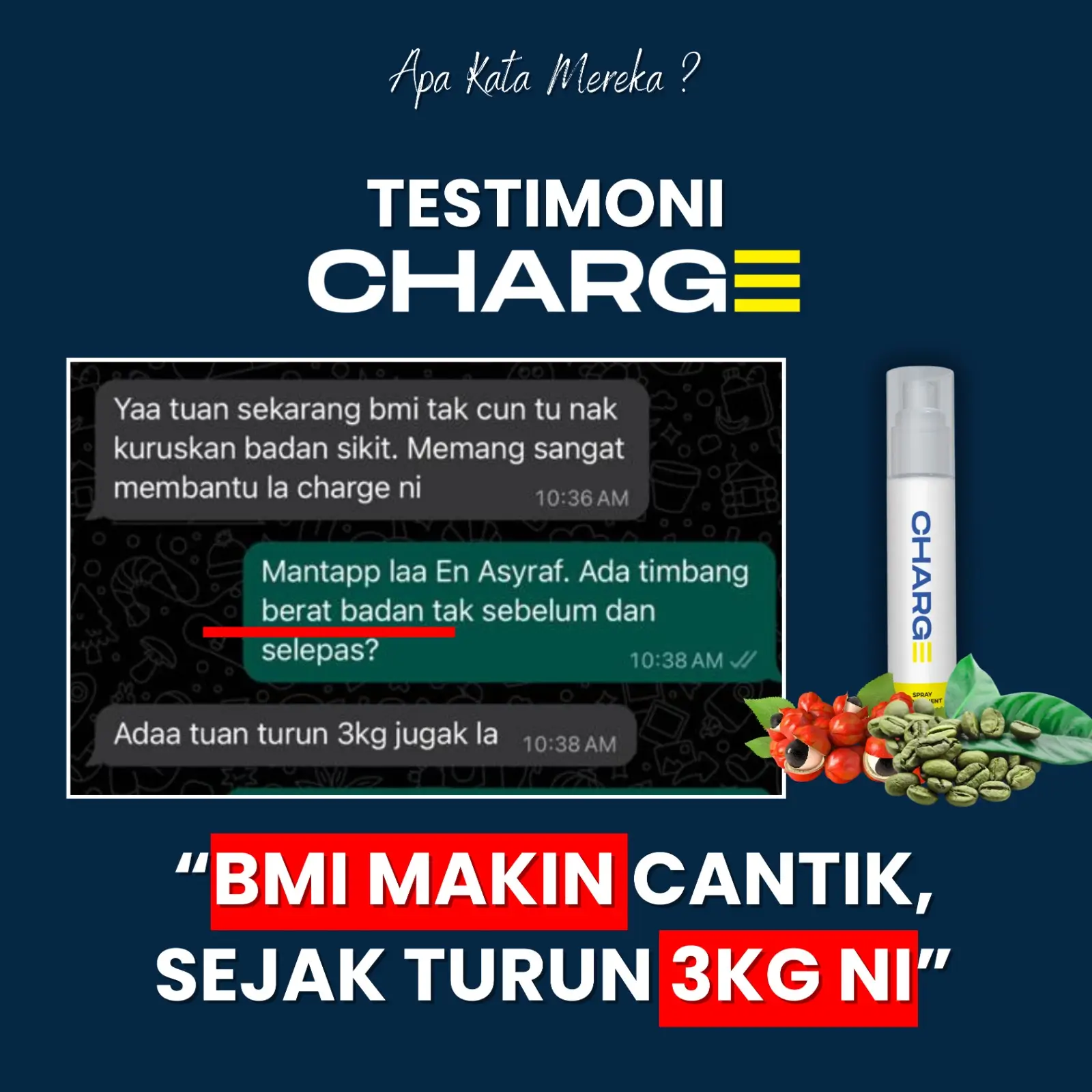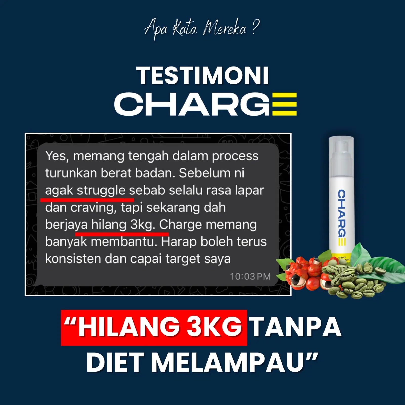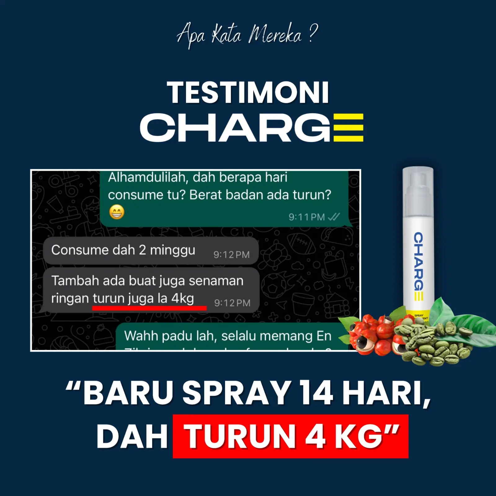 Supplement formulasi saintis yang boleh bantu anda mengawal pemakanan (pengambilan kalori) secara natural dan juga mampu membakar lemak. Disamping itu Charge juga memberikan anda tenaga.